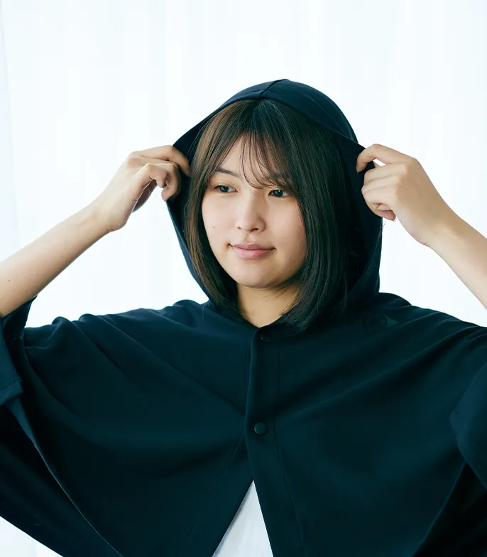 可能。 - ❸ コリやすい首回りもフード着用でしっかり保温。