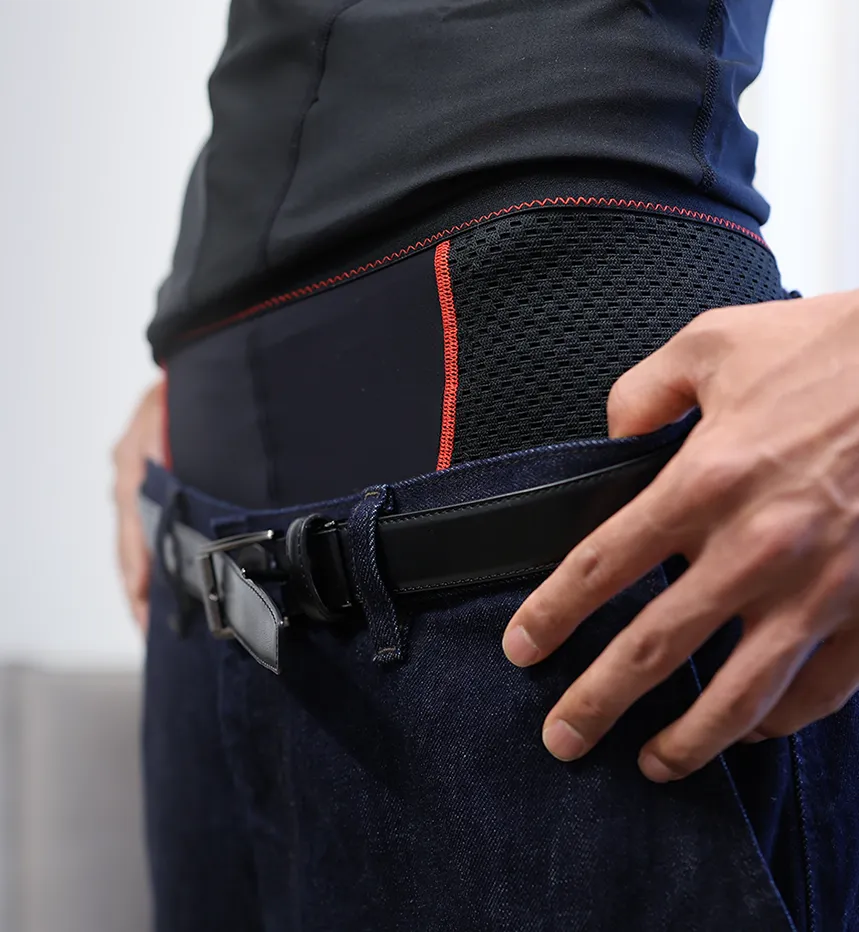 着用時、各ベルトやパネルにより、現代生活で崩れがちな骨盤周りの筋肉バランスを整えサポートします。