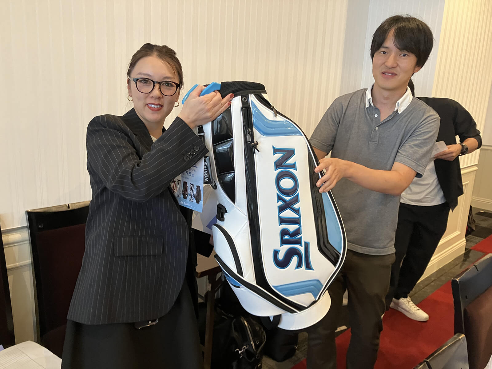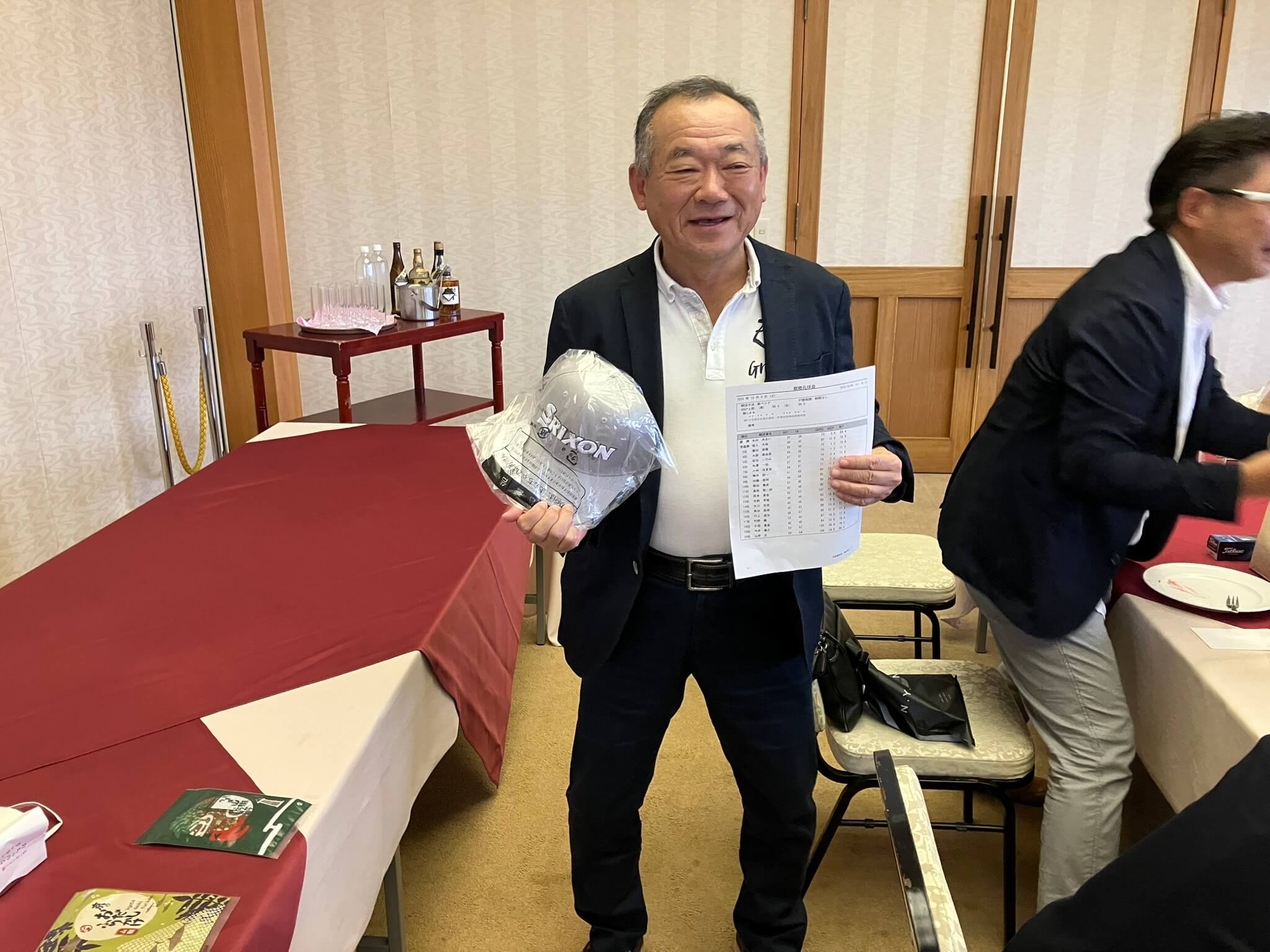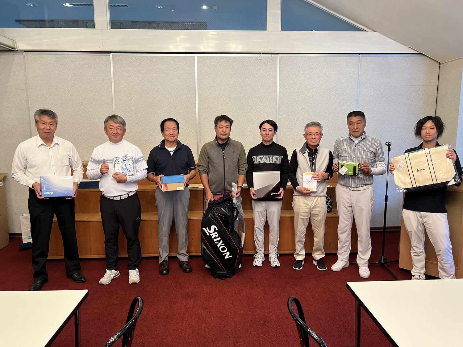 成績も大事ですが、皆様のお目当ては、そうです。恒例の大抽選会です。今大会もたくさんのご協賛品を頂戴しました。感謝申し上げます。中でも最大のお目当ては、ダンロップ提供のSRIXONキャディバッグ!&トートバッグ!です。抽選の結果は、キャディバッグが地域枠でご参加いただきました蕪木敦様でした!ご本人の満面の笑みと周りからの羨ましいなぁ目線が印象的でした!次にトートバッグは、日頃からお世話になっている企業にお勤めの蛭田祐介様でした!ご自身のSNSでトートバッグが当たったことをアップしてくださり、幹事として、ダンロップゴルフアンバサダーとして、とても嬉しく感じました。