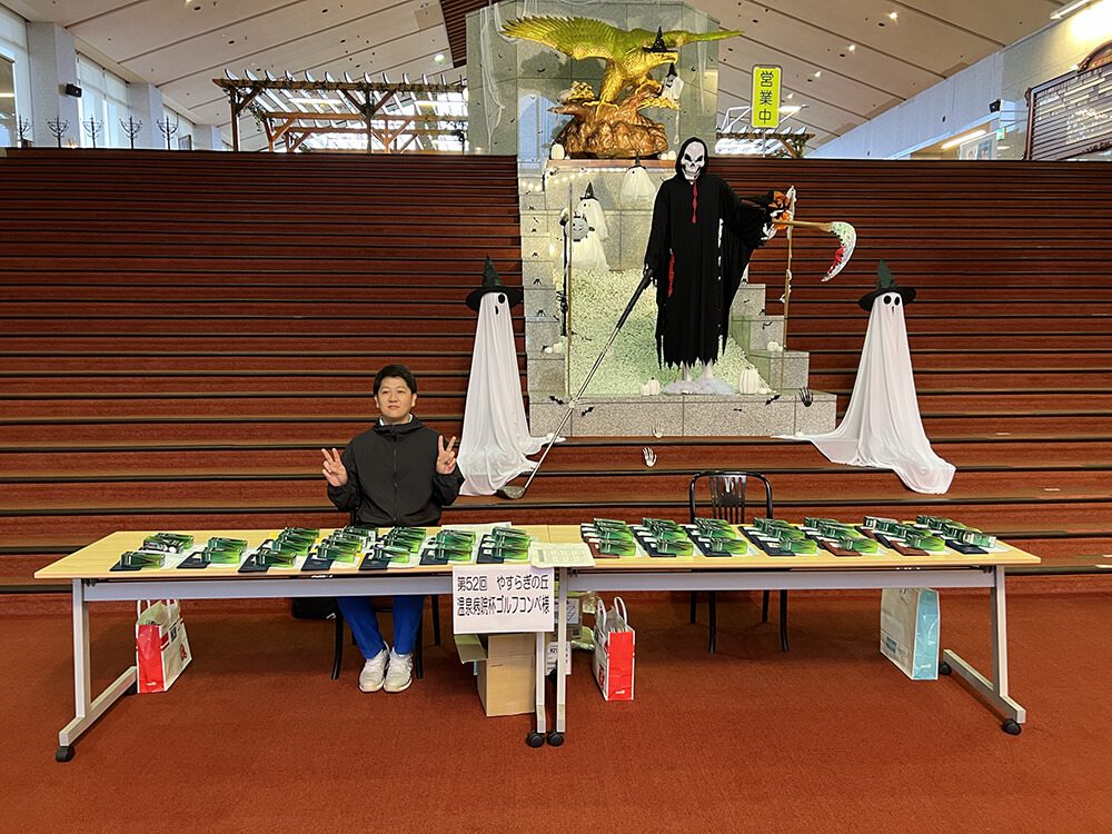 年に2回開催するこのコンペは、医療法人愛正会やすらぎの丘温泉病院の職員と役員、患者様、地域の皆様、関連企業の皆様との親睦を目的として開催し52回目を迎えました。幹事としての準備は万端!心配は、いつものように天気のことだけでした。しかし、台風23号は空気を読んだかのように予報より逸れてくれたお陰で雨に降られることなく開催できました。