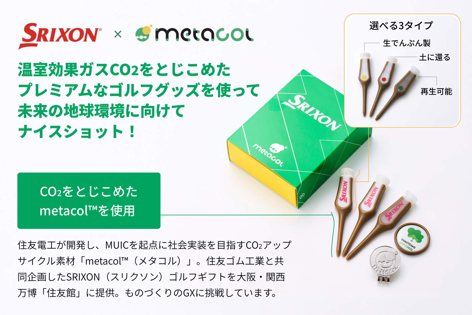 住友電気工業株式会社(以下住友電工)の未来素材であるCO2を固体化したmetacol(メタコル)と3種の環境配慮型樹脂を混ぜた環境にやさしいゴルフティ(3本)とマーカー(1個)のセット。住友ゴムと住友電工で共同企画し、住友電工が製造した製品で、大阪・関西万博「住友館」内「ミライのタネ」でも展示中。
