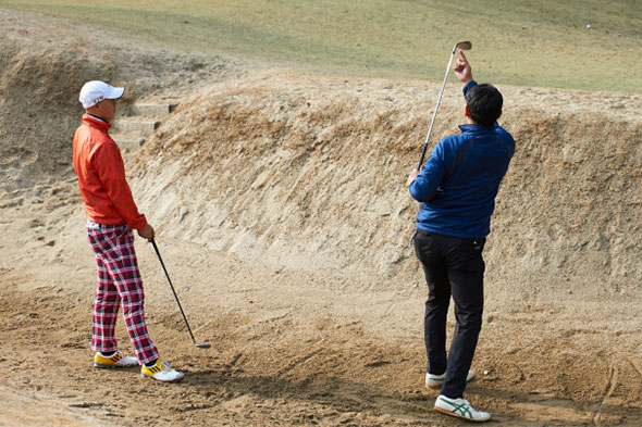 バンカーショットの練習は、ボールを直接打つのではなく、砂ごと出す感覚だとの説明がありました。何度も練習できる貴重なチャンスですね。まずは、成功させる良いイメージを持つことが大切なのだそうです。