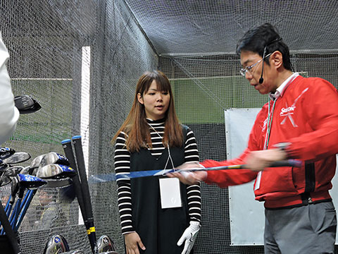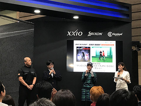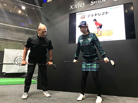 イベント初日にダンロップブースで発表されたのが、ゴルフに特化したエクササイズ「ダンロップ・ゴルフボディイノベーション」。ダンロップがフィットネス事業とゴルフスクール事業で培ってきたノウハウを生かして開発したこのエクササイズは、ゴルフにおける正しい体の使い方に短期間のうちに気づくことで理想のスイングを見つけ、スコアアップにつなげるという、これまでになかったエクササイズです。最終日には、トークショーにも出演した古閑美保プロが挑戦。インストラクターの指導のもと、ゴルフクラブを使ったメニューを体感した古閑プロは、「ゴルフで使う筋肉を鍛えたり、関節の可動域を広げたりするのは、スコアアップのために本当に大切。これはゴルフの動きにぴったりのエクササイズですね。きちんととやると結構きついです(笑)」と、その効能を実感していました。