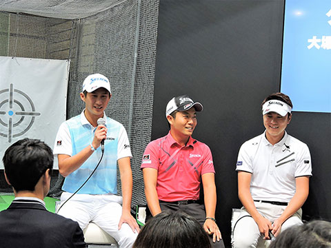 初日の23日(金)には、大堀裕次郎プロ・稲森佑貴プロ・星野陸也プロという若手プロ3人によるトークショーを開催しました。まず、昨シーズンを振り返り、「初優勝ができず悔しかった」という大堀、稲森両プロに対し、星野プロは「無事シード権が獲れてよかったです」と笑顔を見せていました。また、道具の話題では、稲森プロがすでに試合で使用している「ゼクシオ テン」ドライバーについて、「つかまりがいい。とにかくまっすぐ飛びます」と絶賛。その後、3人はステージ上の特設ケージで「ゼクシオ テン」ドライバーを試打。大型モニターに表示されたデータを見て、稲森プロのショットがまったく曲がらないことが分かると、来場者のみなさんからは拍手が起こっていました。さらに、3人は直筆サイン入りキャップをかけてみなさんとジャンケン大会。最後、「今年こそ初優勝したい」と口を揃え、今シーズンの活躍を誓っていました。
