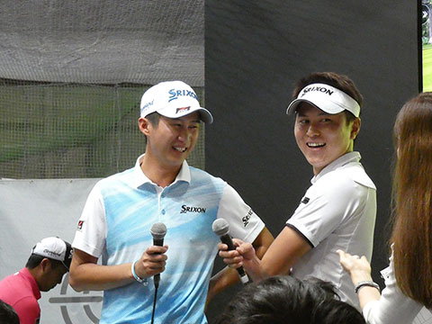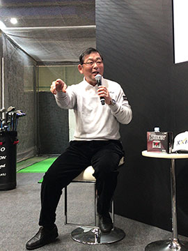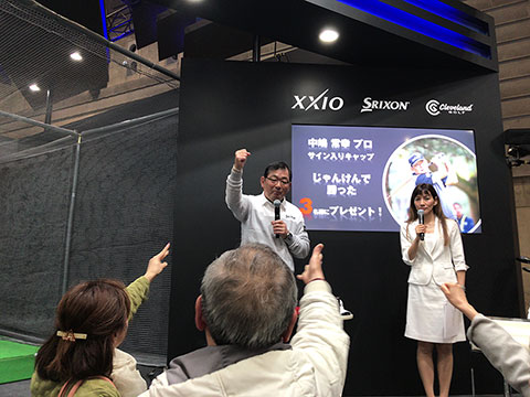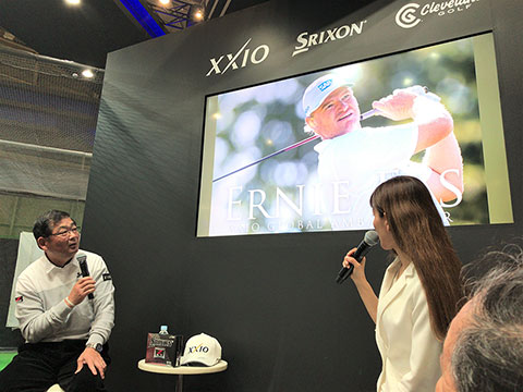 2日目の24日(土)午後には、ゴルフフェアのダンロップブースに毎年出演している中嶋常幸プロが登場。大観衆を前にトークショーを行いました。今年も恒例のスキー合宿を行なったという中嶋プロ。その成果もあってか、今年は例年になく体調がよいそうで、「ギャラリーのみなさんに、“中嶋のゴルフを見に来てよかった”と思ってもらえるようなラウンドをできるだけ多くしたい」と抱負を語っていました。また、すでに自身が愛用している「ゼクシオ テン」ドライバーについて、「やさしく飛んでくれるし、いい音がする。歴代モデルを使ってきたけれど、この10代目がいちばん自分に合っている。だから、今がいちばん調子がいい」と笑顔でコメント。ちなみに、「ゼクシオ テン」の5Wも実戦投入に向け調整中だそうです。また、中嶋プロが「あのアーニー・エルスもゼクシオを使っているんだよ」と話すと、客席からは驚きの声が。さらにエルス選手について、「プロはドライバーが気に入らなければ契約しないもの。それだけゼクシオがいいということ」とゼクシオの完成度の高さを改めてPRしていました。