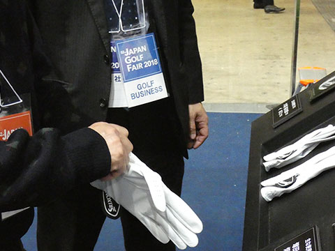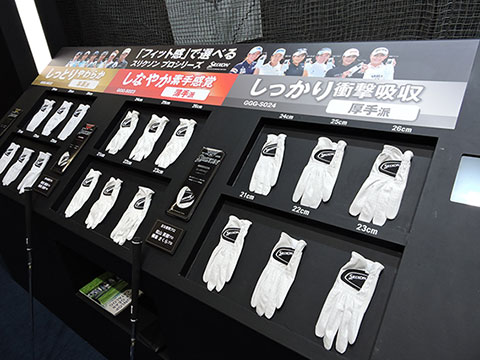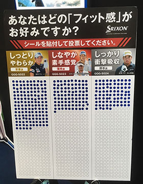 この春、3タイプ揃って新発売されたスリクソンのプロモデルのグローブ。独自のなめし加工により、しっとり柔らかな羊革タイプの『GGG-S022』、合成繊維ナノフロント®を使用し、素手感覚で握れる薄手タイプの『GGG-S023』、人工皮革クラリーノ®の採用で、しっかりとした着用感が得られる厚手タイプの『GGG-S024』と、好みのフィット感に合わせて選べるのが特長です。会場では3タイプの試着用グローブをご用意。着けたあと実際にクラブをグリップしていただき、どれがご自分にいちばんフィットするかをお聞きしました。300人を超えるみなさんにお答えいただいた結果は、羊革タイプが4割、薄手タイプと厚手タイプが各3割という割合に。さて、あなたの好みはどのタイプ?