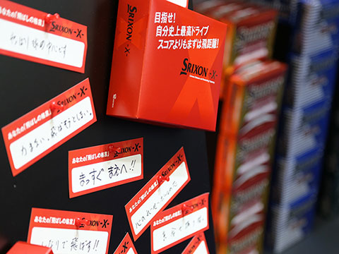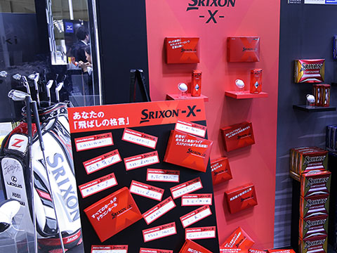 昨年8月に発売され、非常に多くのゴルファーに支持されているスリクソンの飛距離追求型4ピースボール『スリクソン -X-』。高い空力特性を誇る「スリクソン Z-STARシリーズ」と同配列のディンプルや、高い反発力を生む薄カバー、高初速を実現する新開発のミッド層などの組み合わせにより、他社の非公認球に負けない飛びが自慢のR&Aルール公認球です。同製品の展示コーナーでは、2日目と3日目に来場者のみなさんから「飛ばしの格言」を大募集。コーナー内に設置されたボードには、「80%の力で振る」「欲を捨てる!!」など、みなさんの飛ばしにかける思いが伝わる格言が並んでいました。ご応募くださった約300人の方には、謝礼として『スリクソン -X-』を1個プレゼント。ご応募くださったみなさん、ありがとうございました。
