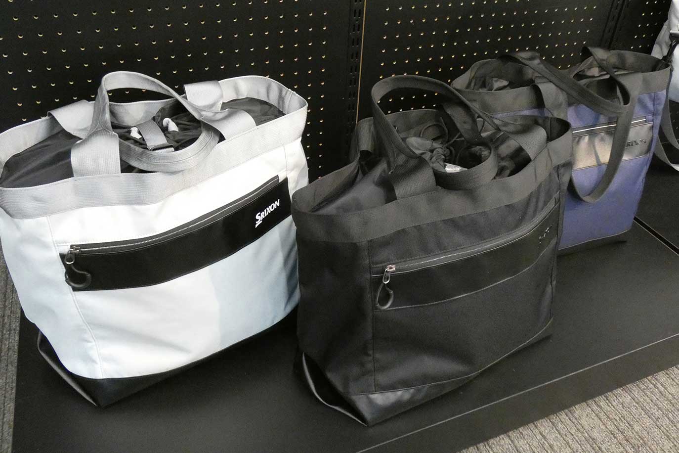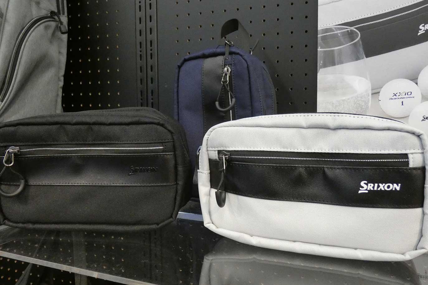 バッグ類も「スリクソン・カジュアル」というコンセプトで4つの商品をラインアップ。ボストンバッグ、トートバッグ、ダブルポーチは軽量のポリエステルを使用し、ブラック、ネイビー、ライトグレーという全体的にシックな色展開。また、ブラックとグレーの2色から選べるリュックは、PC収納用ポケットを設けるなど、どれもゴルフだけでなくタウンユースも可能なテイストに仕上がっているのが特長です。