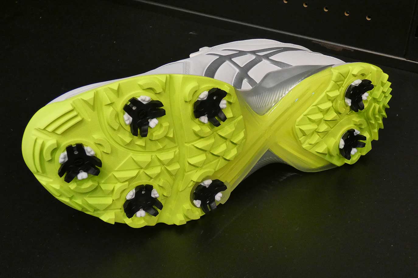 アウターソールは、松山プロの要望で実現した「PRO M」の機能を踏襲。前足部とかかと部の幅を、上から見るとはみ出すほど広くし接地面積を大きく取ることにより、パワフルなスイングのゴルファーでもしっかり踏み込めるのがポイント。また、ソール全体はラバーであるものの、中足部に搭載したX字状の樹脂パーツが、スイング中のひねり動作時に足元のブレを抑え、スイングが安定します。