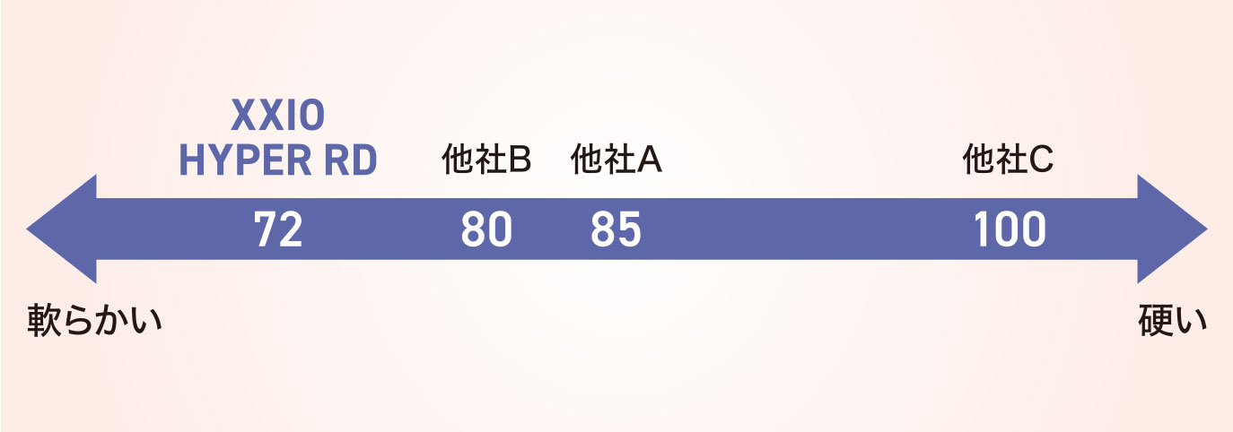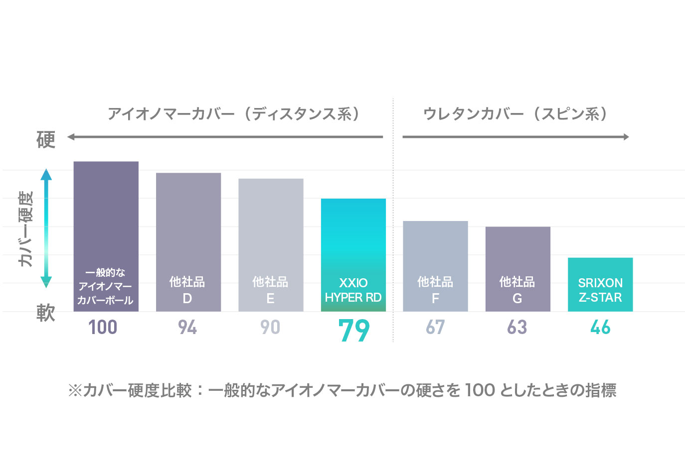 児島:はい。各社のスピン系ボールのウレタンカバーを比較すると、当社の「スリクソン Z-STAR」は最高レベルにソフトなのですが、『ハイパー RD』のソフトアイオノマーは他社のウレタンカバーに肉薄する柔らかさを実現しています。スピン系ボール「スリクソン Z-STAR」のウレタンカバーは、他社製品と比べて最高レベルにやわらかく、そのうえ薄くすることで、反発性能の低さというウレタンのネガティブな要素をカバーしています。一方、ゼクシオのような打感を重視するソフトコンプレッションのボールでは、ウレタンを採用した際の反発の低さが懸念材料でした。そこで、ウレタンよりも反発性能の高いアイオノマーカバーをソフト化させました。