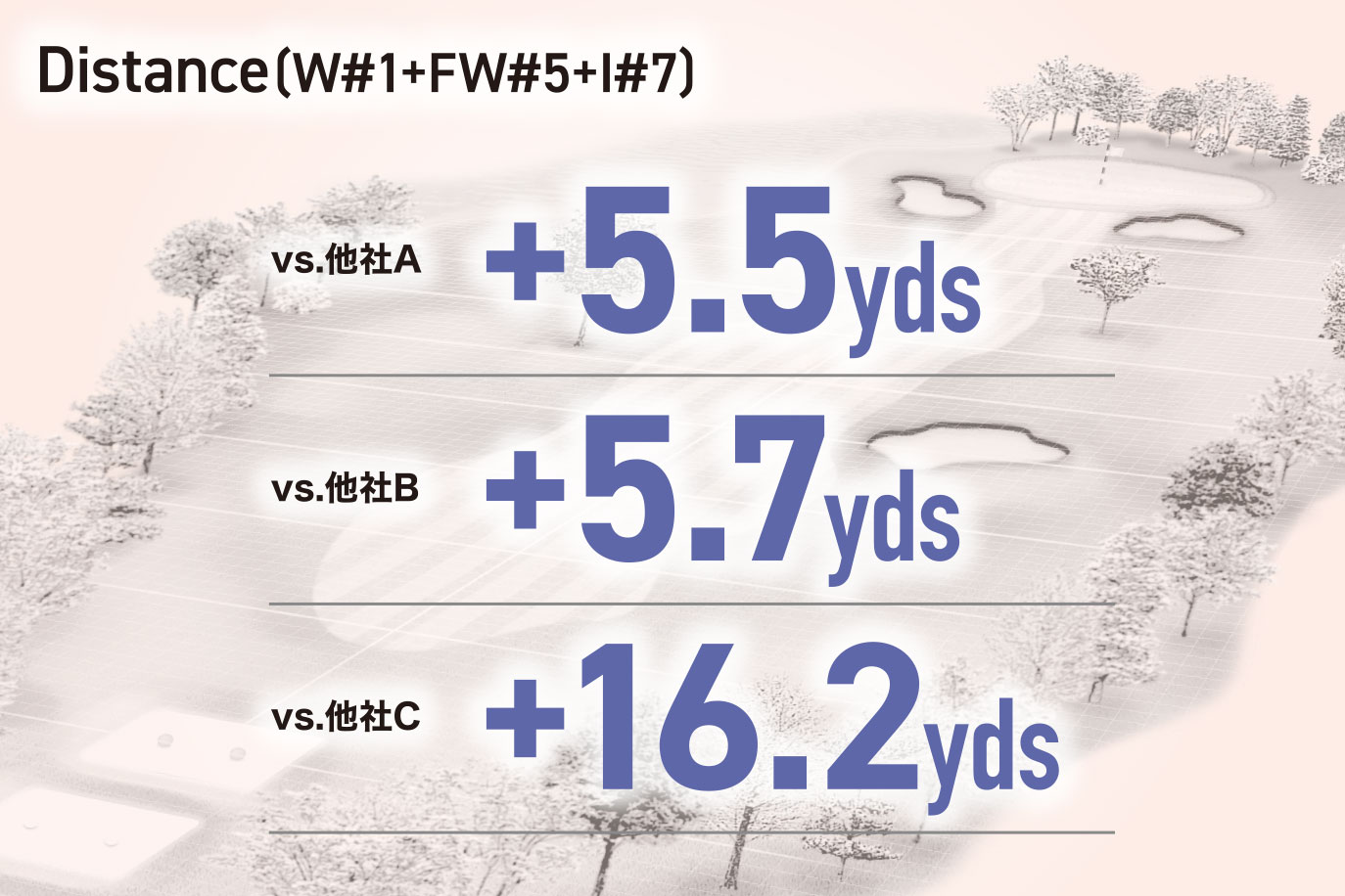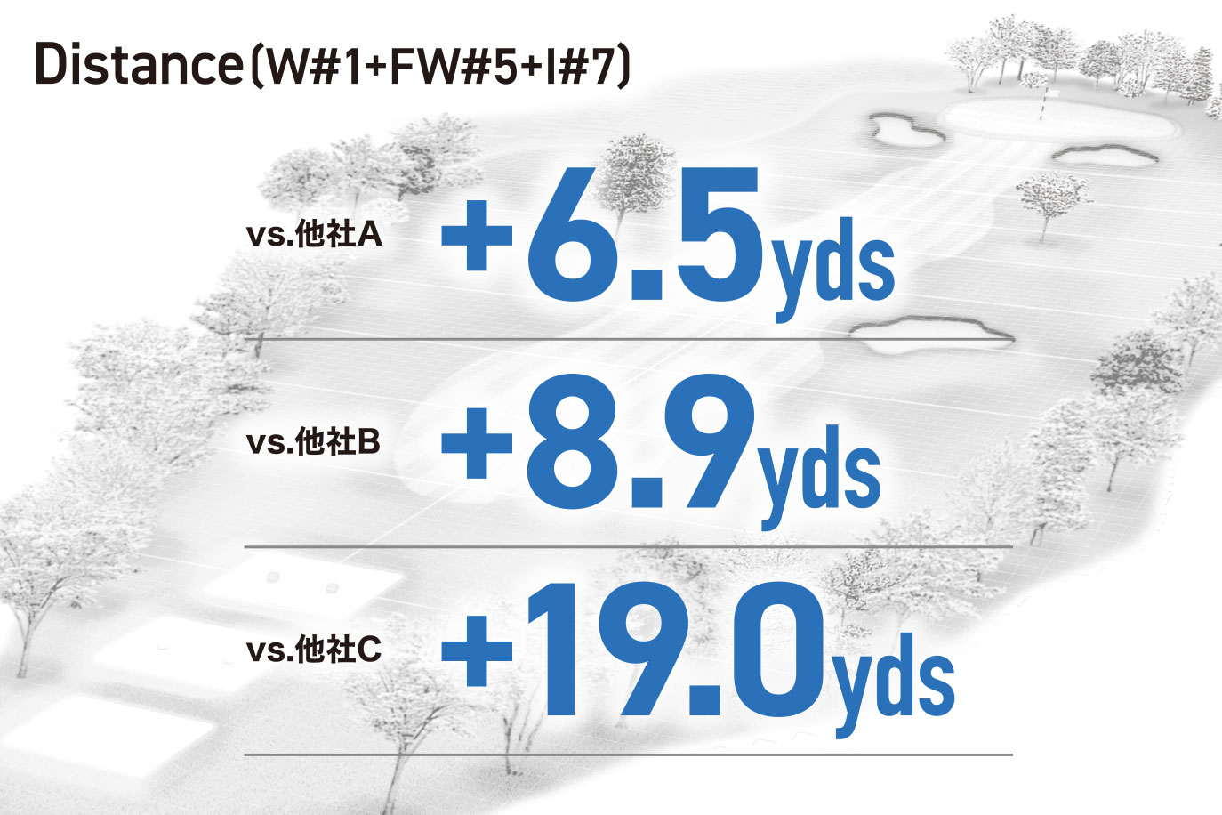 尾野:はい。他社のディスタンス系ボールと飛距離を比較すると、ドライバー、フェアウェイウッド(#5)、アイアン(#7)の合計で『ハイパー RD』はどのボールよりも飛んでいます(※下図参照)。3つの番手の合計で比較したのは、『ハイパー RD』がドライバーだけでなくアイアンで打っても飛ぶボールだからです。