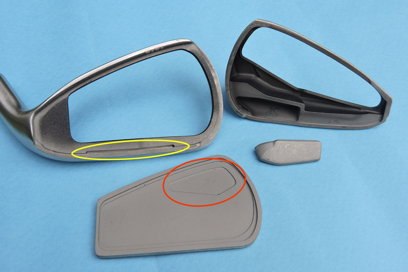 『ゼクシオ 14+ アイアン』のボディ。下部の空洞(赤い囲み)を下方向に広げソールを薄肉化したことでソールのたわみが大きくなった。また、キャビティ部分をヒール側に広げ(黄色い囲み)余剰重量を創出。軽量化につなげた。