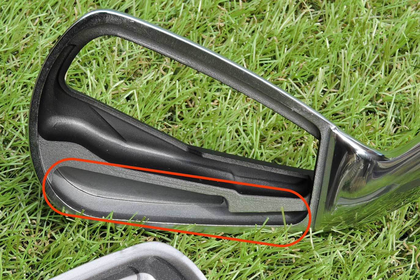 それにより、L字型の溝の付近では前方のボディは剛性が低くなり、フェースはより大きくたわむ。それにプラスして、溝より後方の剛性の高いボディが、たわんだフェースのパワーをしっかり受け止めることで初速がアップするのだ。