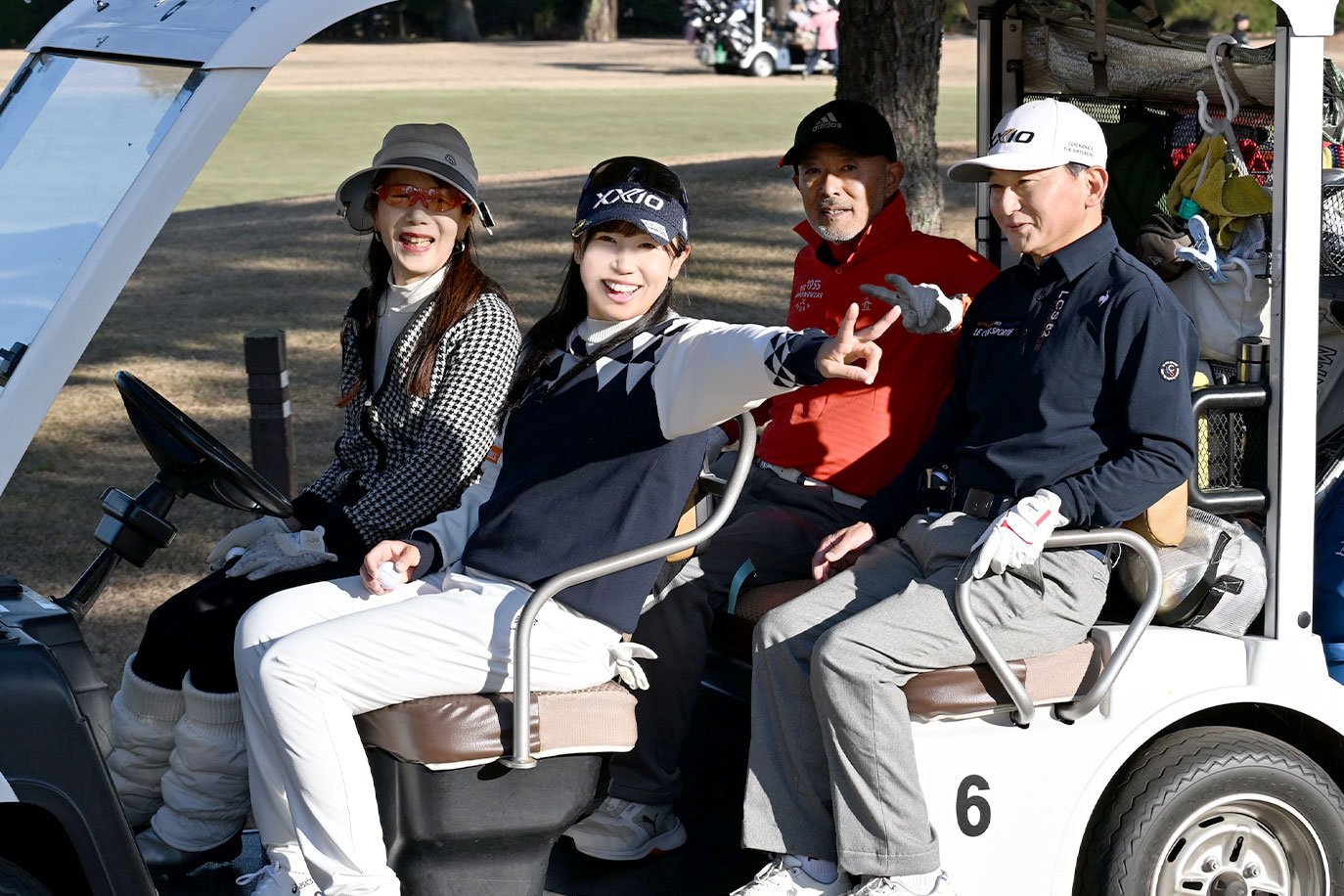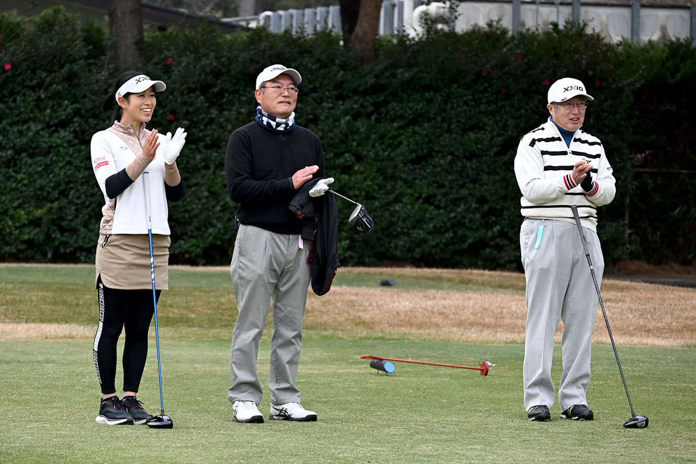 今回のコンペで、ゲストのみなさんは、OUTコースを関東会場は2名、関西会場の1名のプロとそれぞれプレー。スタートホールのティーイングエリアでは、同じ組でプレーするプロとゲストによる記念撮影を実施。また、運営スタッフがゲストからスマホをお預かりして撮影も行ったあと、みなさん颯爽とティーオフしていきました。
