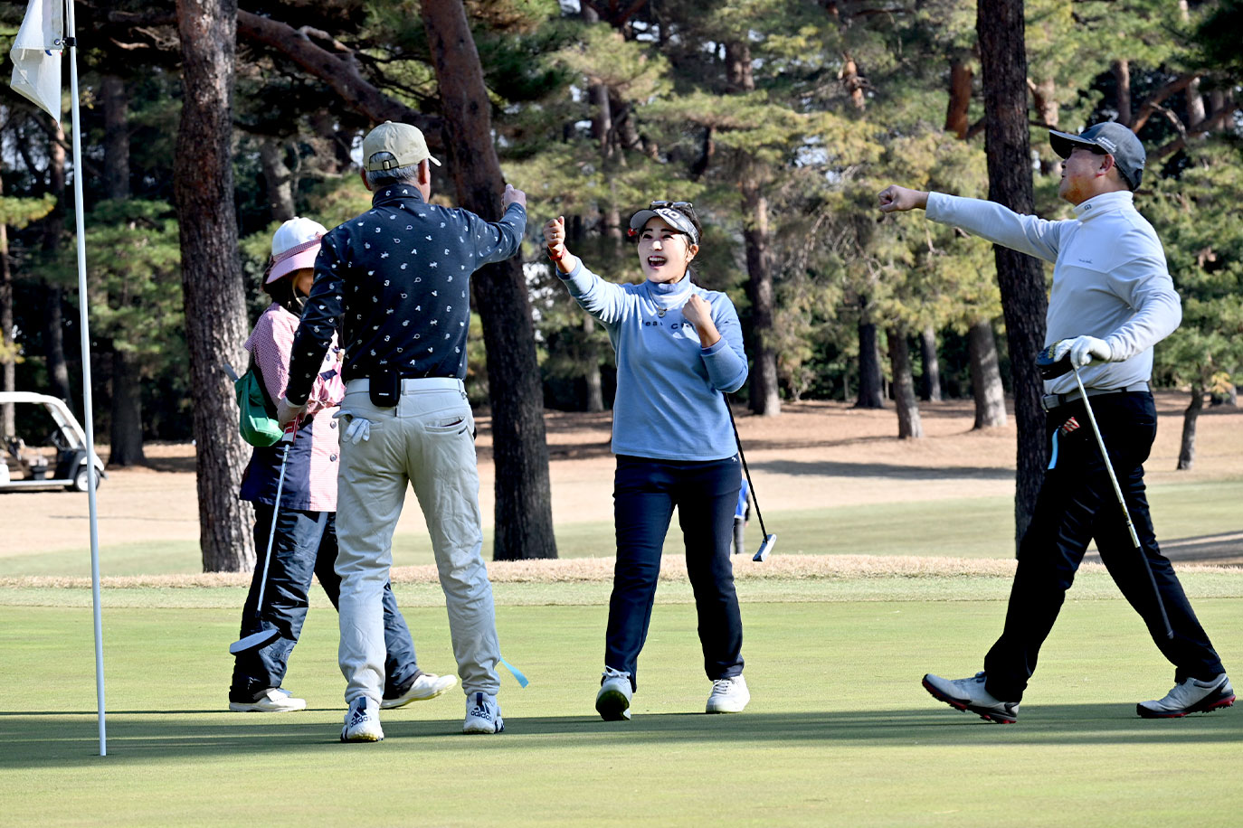 さて、競技方法ですが、今回もゲスト3人にプロが加わるスクランブル方式によるチーム戦。プロのティショットを選択できるのはハーフで2回まででしたが、第2打以降はプロのショットやパットを何度でも選択できるため、バーディが続出するハイレベルの争いに。バーディパットが決まってプロとゲストのみなさんがハイタッチするという本イベントでお馴染みの光景があちこちで見られました。