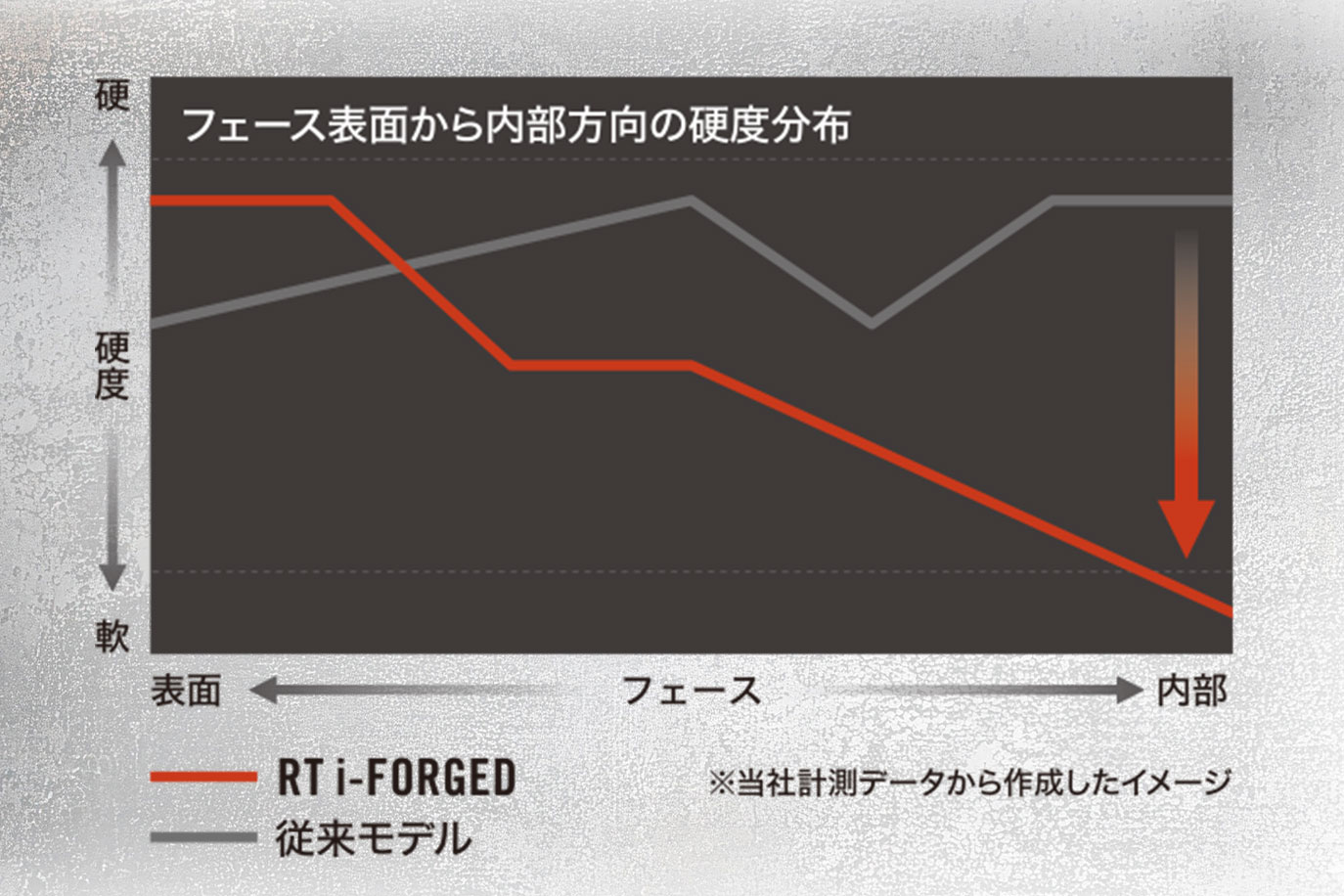 Q:『RT i-FORGED』のフェース面の硬度分布図を見ると、前作は比較的フラットだったのに対し、表面から内部にいくほどやわらかくなっていますね。