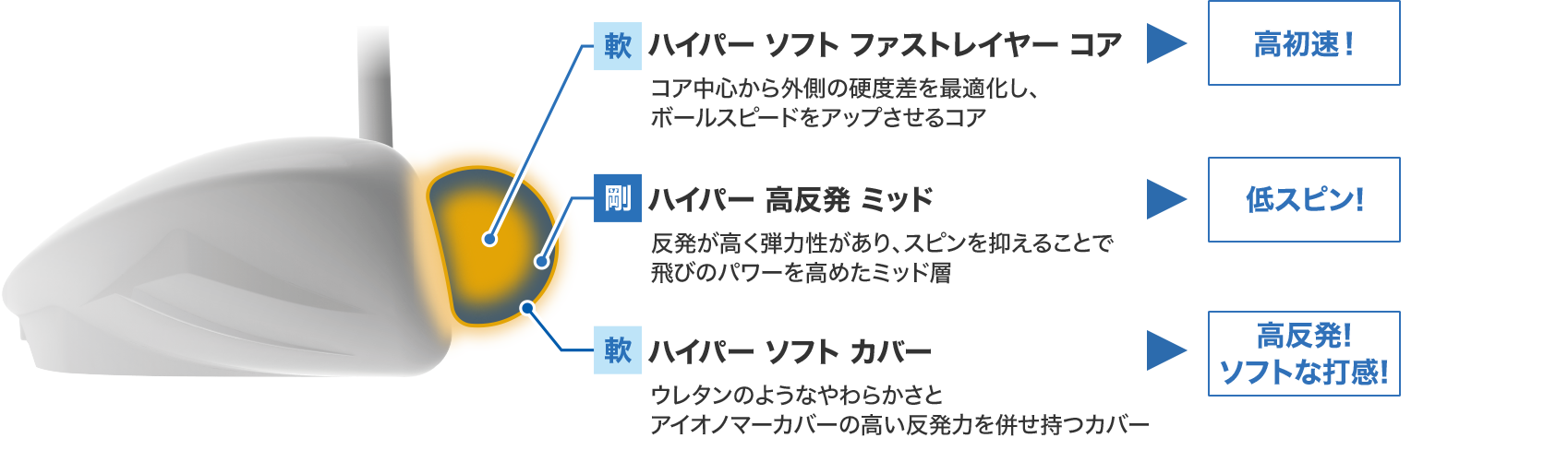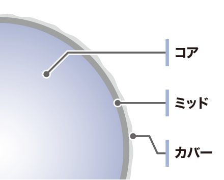 カバー | 低スピンかつ反発を高めるため、 硬度アップ |