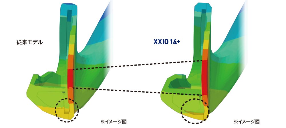 ボディ下部に新たな溝を創出することで、低剛性化を実現。