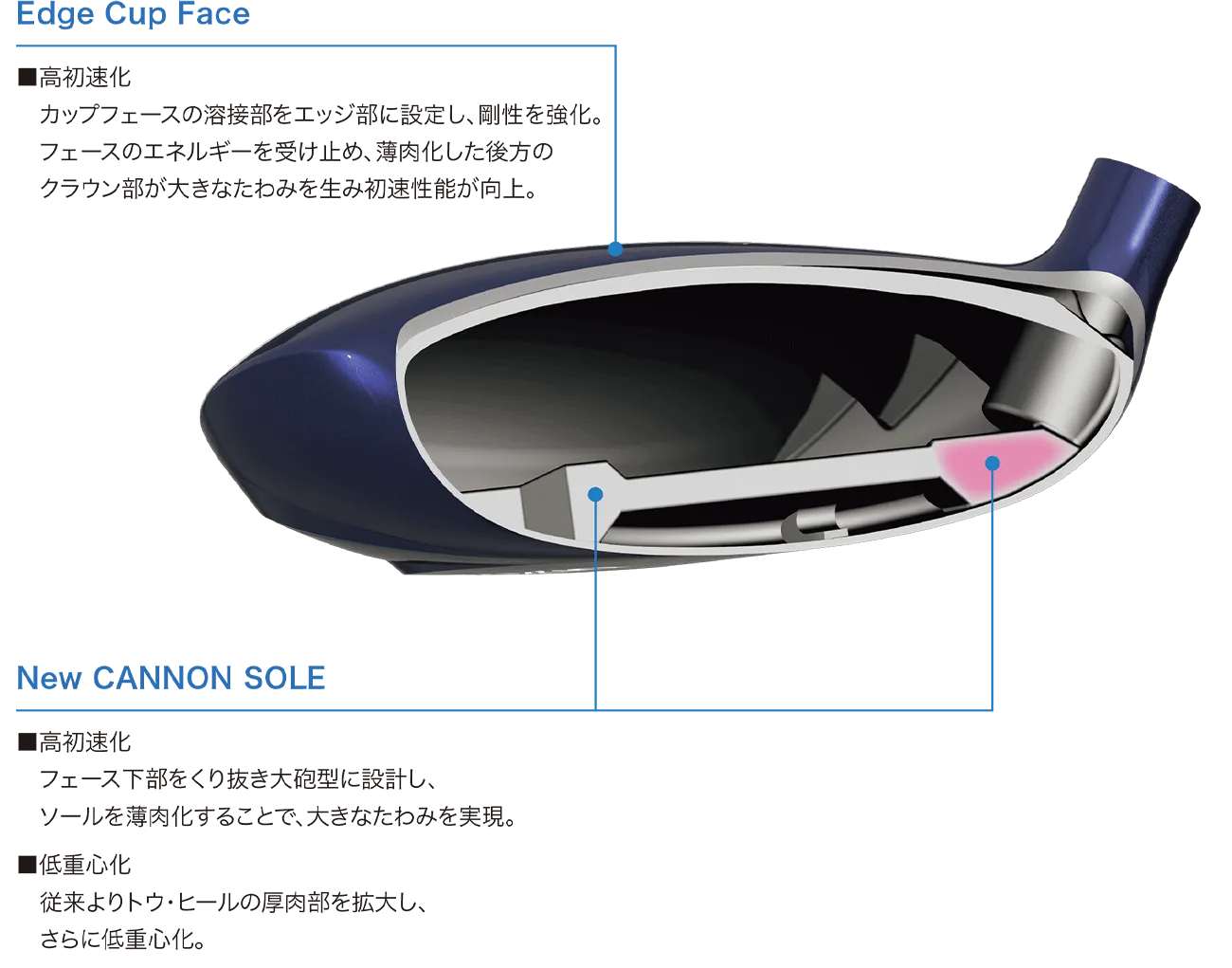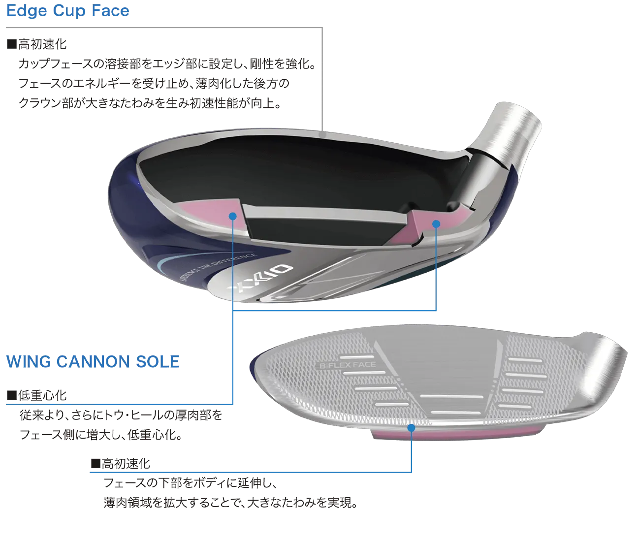 ハイブリッドは女性のヘッドスピードでもしっかり飛ばせるようにフェース下部を薄肉化。