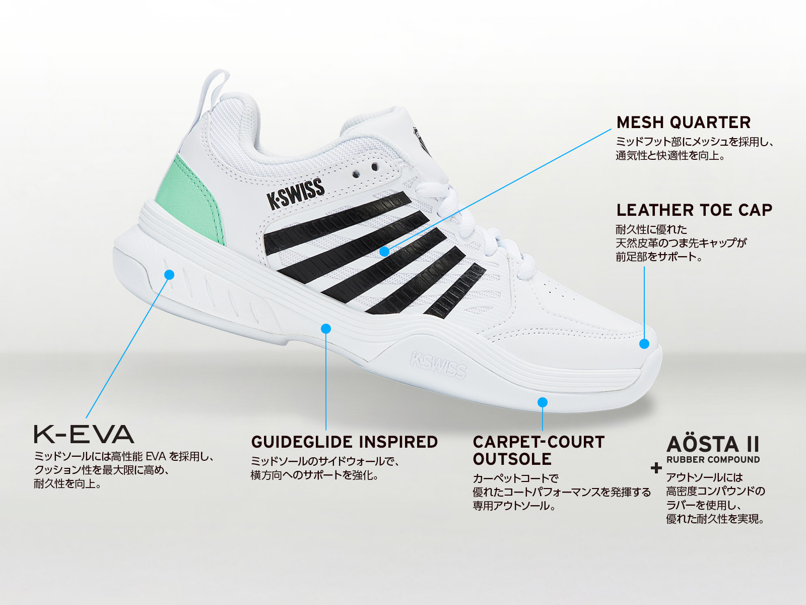 カーペットでのレベルアップに適したケイ・スイスシューズ。 優れた快適性とサポート性を実現したカーペットコート用モデル。