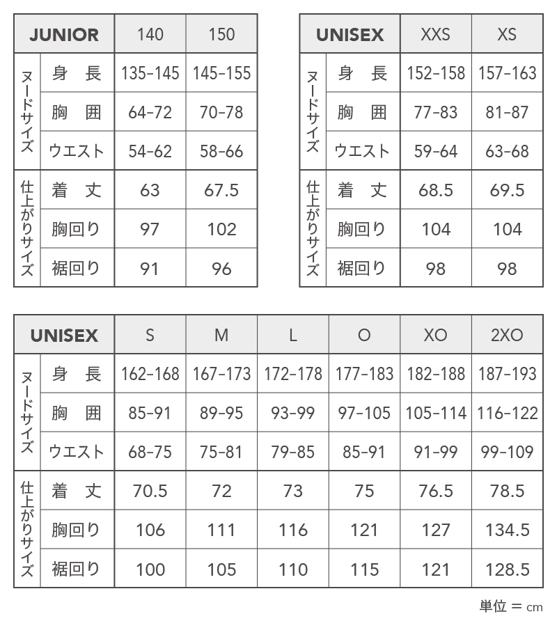 | サイズ | 140、150、XXS、XS、S、M、L、O、XO、2XO |