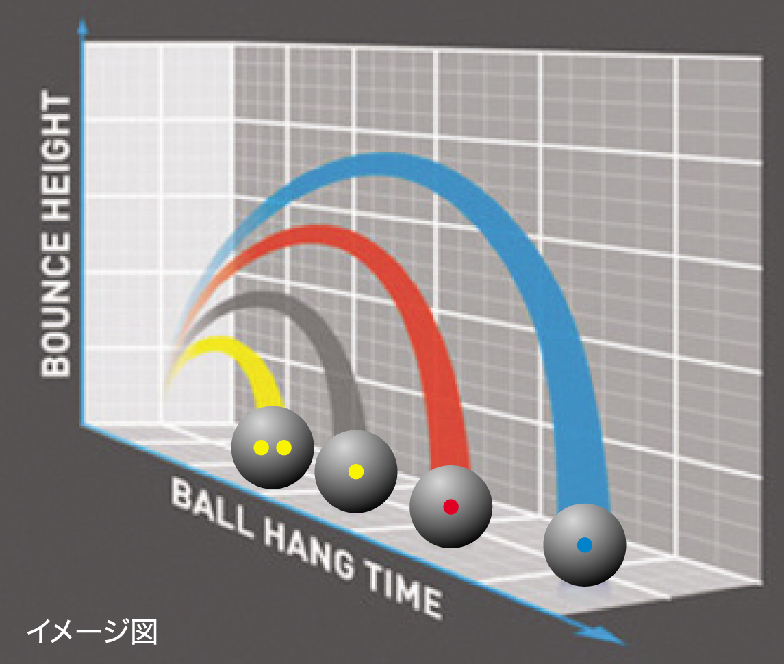 スカッシュボールはゴルフボールとほぼ同じくらいのサイズ感で、重量約24gの中空ゴム製ボールです。弾み方で種類が分かれ、上級者向けは直径約40mmの標準サイズで、弾みにくいボール(ダブルドット)、初心者や練習用は、弾みやすいボール(シングルドット)が使われており、サイズがやや大きいものもあります。上級者向けのダブルドットのボールは冷えていると弾みにくいため、床に強めに叩きつけたり、壁に強打したりして、ボールを温めて使用するノックアップが欠かせません。青色のシングルドットのボールは最も良く弾み、煩わしいノックアップの必要もなく、ラリーもよく続き、初心者はこのボールから始めましょう。