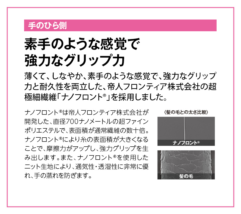 ありがたくも、それが認められ、ご愛顧いただいているのが……ダンロップ【レディスグローブ】コレクションです。最大のポイントは「第二の手のひら」と感じられるほどのフィット感。手のひら部分には、帝人フロンティア(株)の高機能繊維「ナノフロント®」を採用しており、しっとりと馴染むうえに、素手以上のグリップ力を発揮すると、高く評価されています。