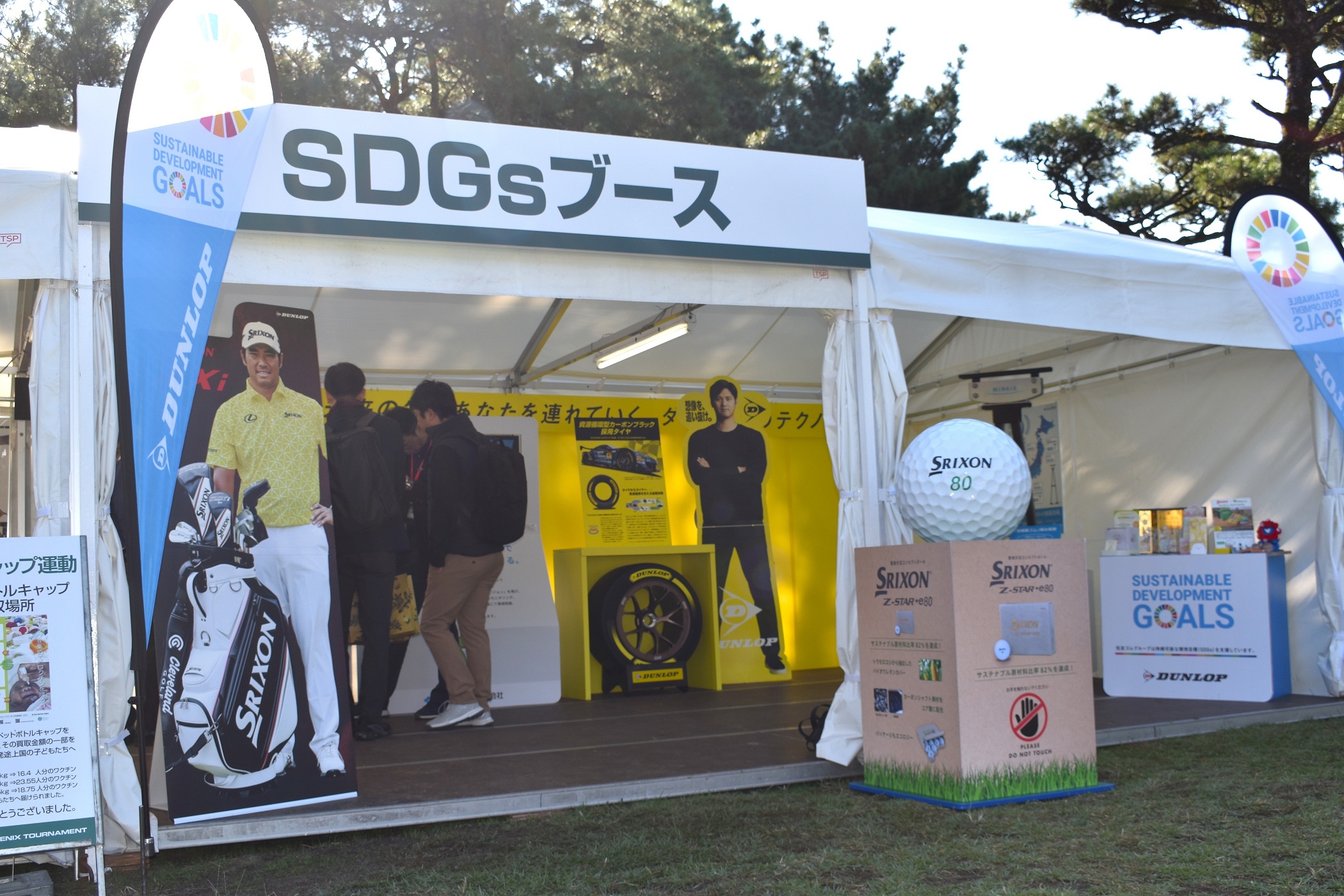 このほかブース内では、ダンロップと同じ住友グループの住友電気工業が、CO₂と金属(主に鉄)を使って生成する環境配慮型の〝未来素材〟「metacol(メタコル)」を材料に使って製造した「SRIXON×metacol ゴルフギフト グロリアスモデル」や、タイヤ事業部、ハイブリッド事業部のSDGs達成のための製品も展示し、全社で環境に配慮したものづくりを進めている姿勢をギャラリーの皆さんにPRしました。