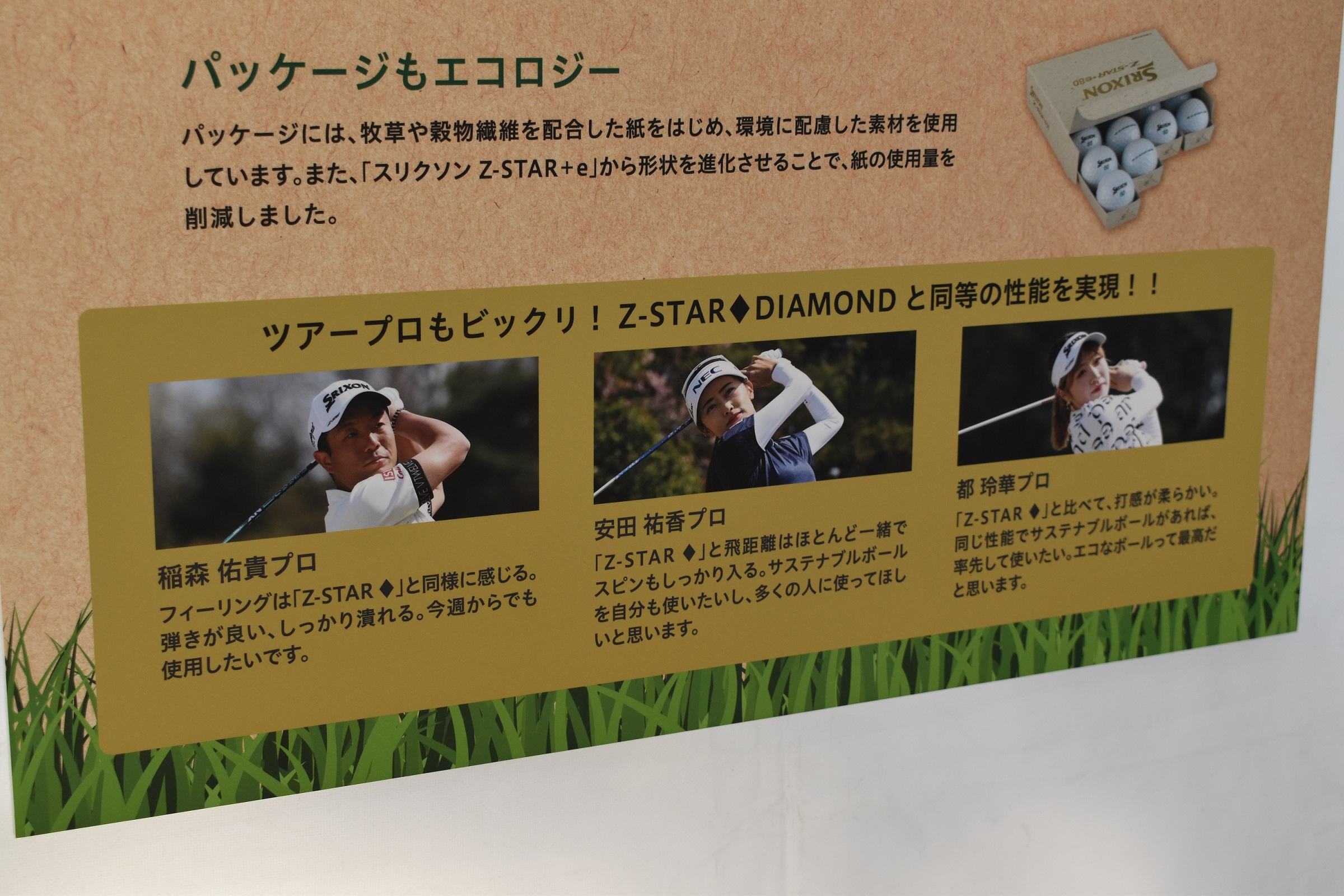 これらの植物由来の材料を採用しながらも、多くのツアープロたちも使用する「スリクソンZ-STAR◆DIAMOND(ダイヤモンド)」とほぼ同等の性能を実現したのは画期的と言えるでしょう。